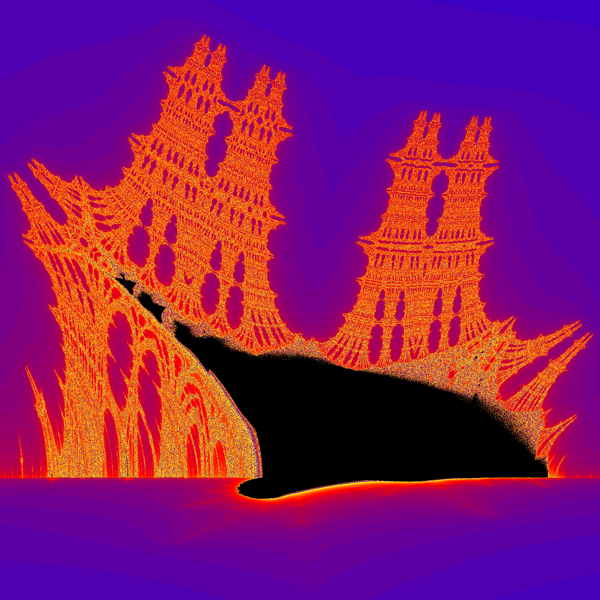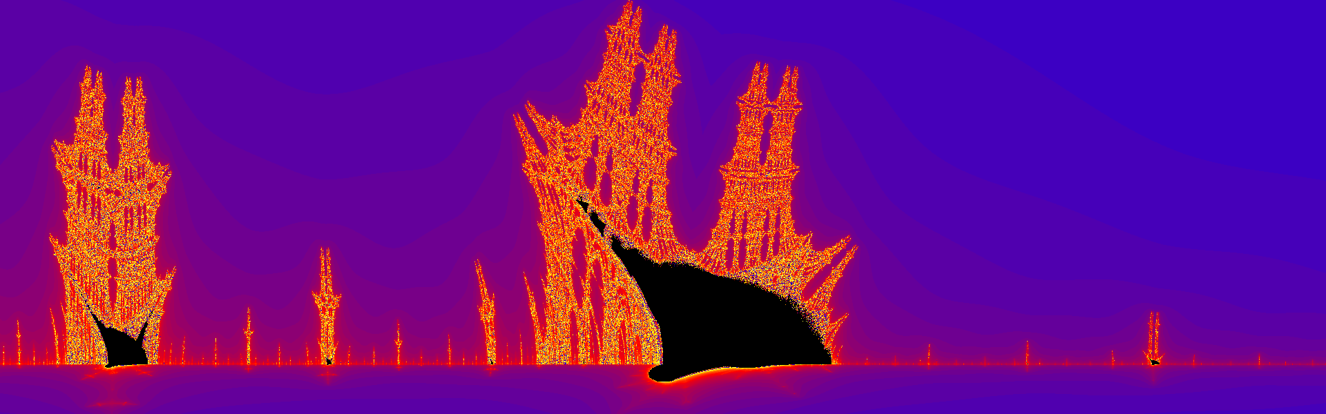 We render the Burning Ship Fractal using the \(L\) function just like we did with the Mandelbrot Set. The general idea is to map an array of pixels making up the raster image to a rectangular region of the complex plane, and color each pixel of the image based upon a color scale for the computed value of the \(L\) function. Coding up this idea leads to the following C++ program: