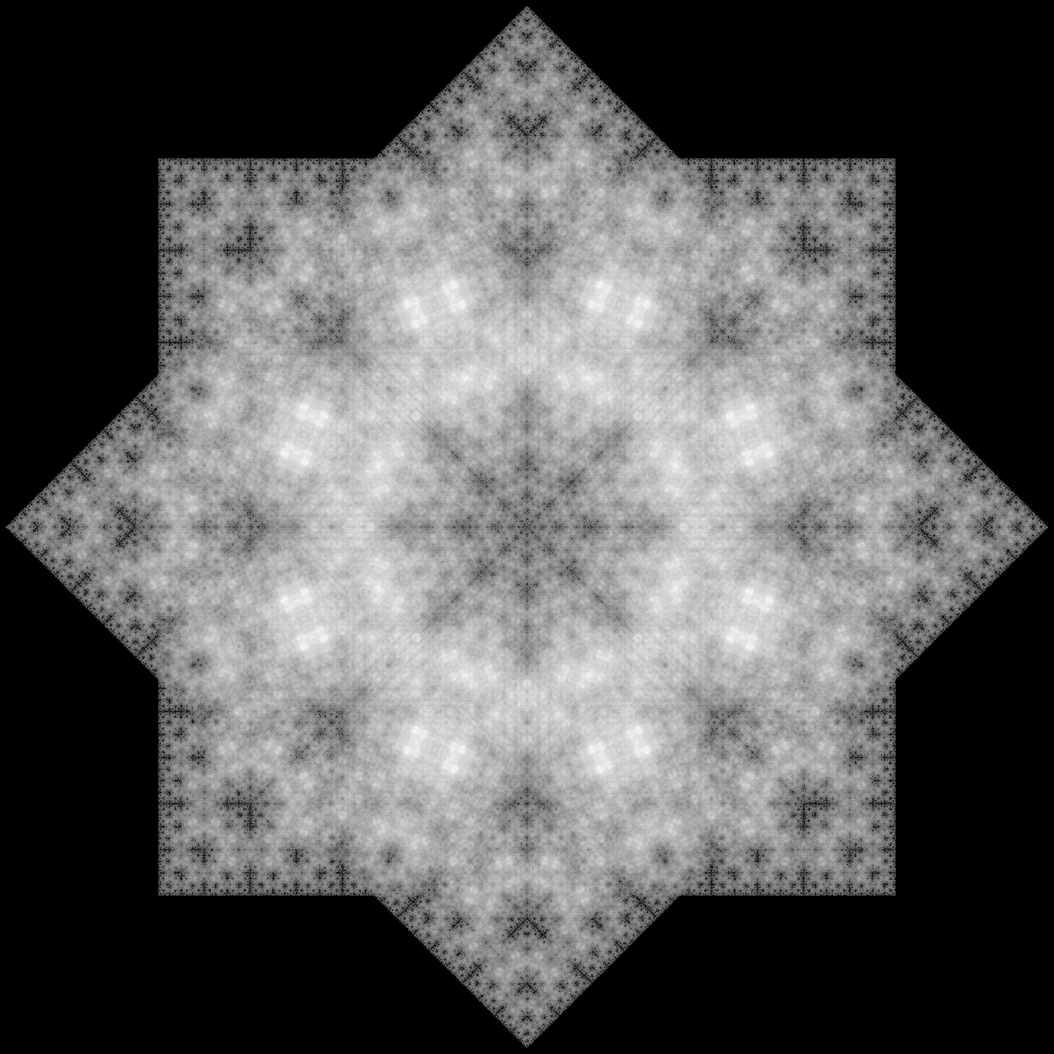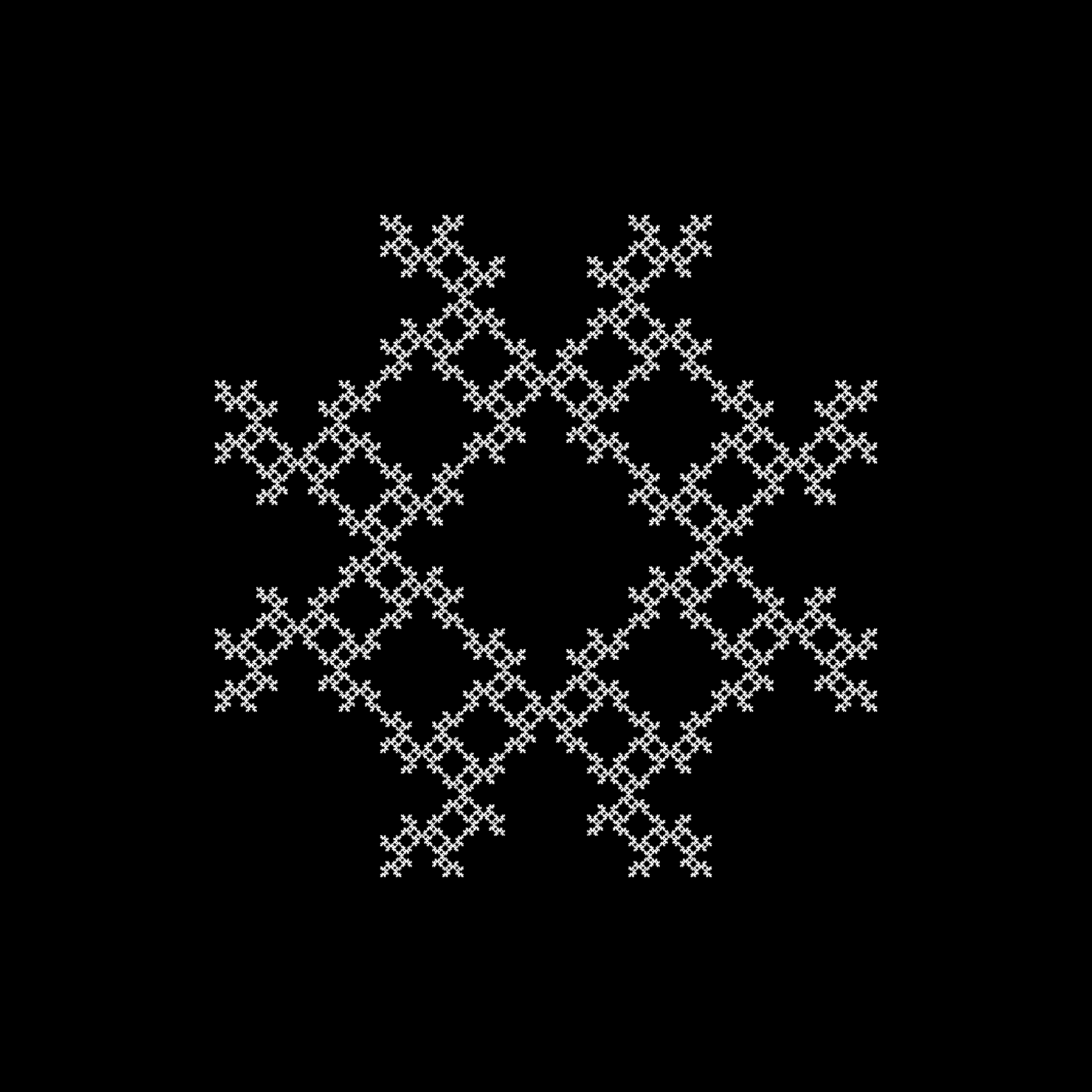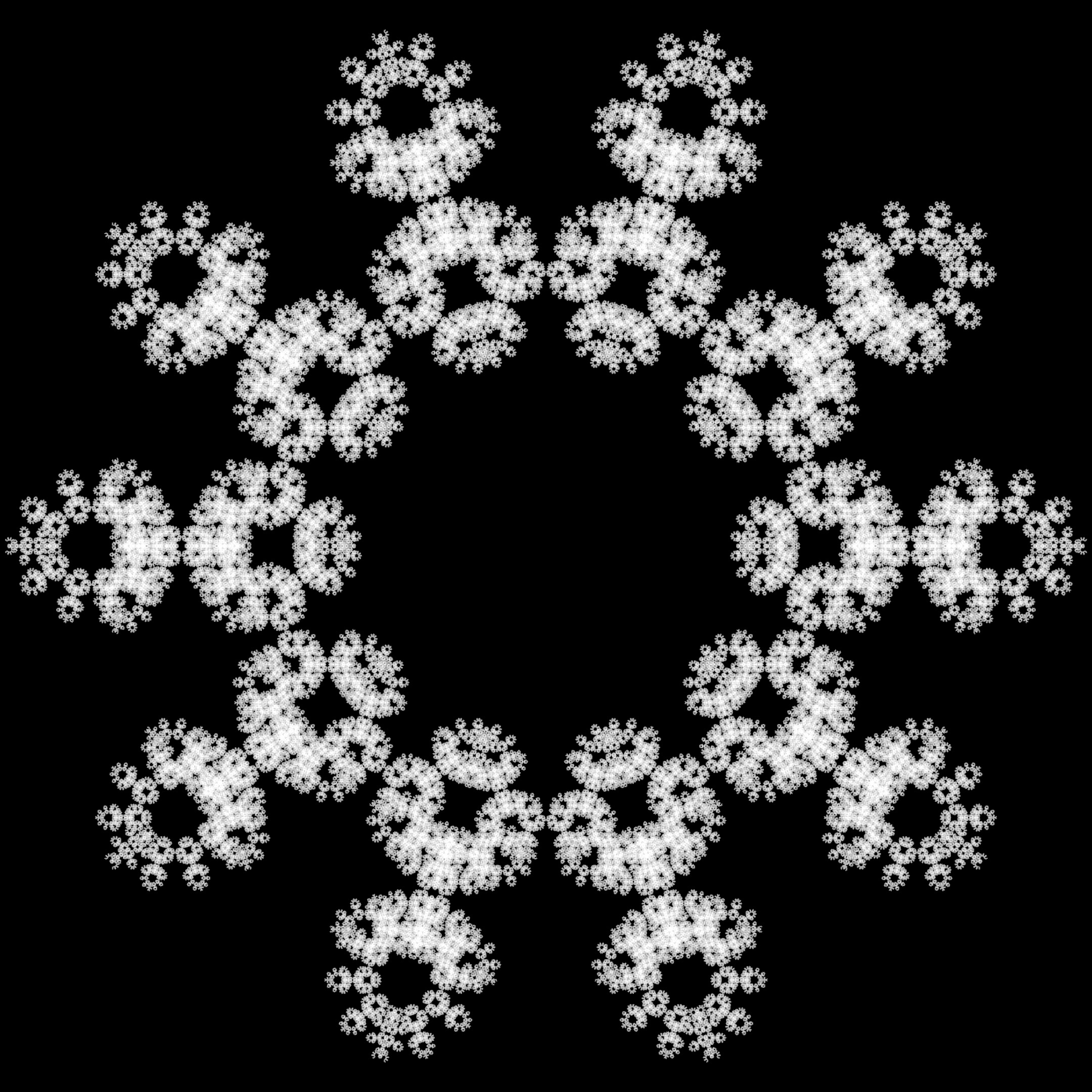 #include "ramCanvas.hpp" struct ifs { long itrMax; long itrToss; int numPts; int lastAvoidForward; int lastAvoidBackward; int lastAvoidLast; double factor; double radius; }; std::vector<ifs> ifsList { { 10000000, 1000, 3, -1, -1, -1, 2.0, 1.10}, {100000000, 1000, 4, -1, 1, -1, 2.0, 1.10}, {100000000, 1000, 4, -1, 2, -1, 2.0, 1.10}, {100000000, 1000, 4, -1, -1, 1, 2.0, 1.10}, {100000000, 1000, 4, -1, -1, -1, 2.0, 1.10}, {100000000, 1000, 4, -1, -1, -1, 2.3, 1.10}, {100000000, 1000, 5, 1, 1, -1, 2.0, 1.10}, {100000000, 1000, 5, 2, 2, -1, 2.0, 1.10}, {100000000, 1000, 5, -1, 1, 1, 2.0, 0.75}, {100000000, 1000, 5, -1, 1, -1, 2.0, 1.10}, {100000000, 1000, 5, -1, 2, -1, 2.0, 1.10}, {100000000, 1000, 5, -1, -1, 1, 2.0, 0.84}, {100000000, 1000, 5, -1, -1, 1, 2.0, 1.10}, {100000000, 1000, 5, -1, -1, 1, 2.3, 0.70}, {100000000, 1000, 5, -1, -1, -1, 2.0, 1.10}, {100000000, 1000, 5, -1, -1, -1, 2.3, 1.10}, {100000000, 1000, 6, 2, 2, -1, 2.0, 1.10}, {100000000, 1000, 6, 3, 1, -1, 2.0, 1.10}, {100000000, 1000, 7, 1, -1, 1, 2.5, 0.65}, {100000000, 1000, 7, 2, -1, 1, 2.5, 0.65}, {100000000, 1000, 7, 3, 3, 1, 2.5, 0.65}, {100000000, 1000, 7, 3, -1, 1, 2.5, 0.65}, {100000000, 1000, 7, 5, 5, 1, 2.5, 0.65}, {100000000, 1000, 7, 5, -1, 1, 2.5, 0.65}, {100000000, 1000, 8, 1, 1, 1, 2.0, 0.75}, {100000000, 1000, 8, 1, 1, -1, 2.0, 1.01}, {100000000, 1000, 8, 2, 2, 1, 2.0, 0.94}, {100000000, 1000, 8, 3, 3, 1, 2.0, 0.94}, {100000000, 1000, 8, 5, 1, 1, 2.0, 0.94}, {100000000, 1000, 8, 5, 2, 1, 2.0, 0.94}, {100000000, 1000, 8, 5, 5, 1, 2.0, 0.94}, {100000000, 1000, 10, 1, 1, 1, 2.5, 0.57}, {100000000, 1000, 10, 1, 9, 1, 2.5, 0.65}, {100000000, 1000, 10, 2, 2, 1, 2.5, 0.65}, {100000000, 1000, 10, 3, 3, 1, 2.5, 0.65}, {100000000, 1000, 10, 4, 4, 1, 2.5, 0.65}, {100000000, 1000, 10, 5, 5, 1, 2.5, 0.65}, {100000000, 1000, 10, 6, 1, 1, 2.5, 0.65}, {100000000, 1000, 10, 6, 6, 1, 2.5, 0.65}, {100000000, 1000, 10, 7, 7, 1, 2.5, 0.65}, {100000000, 1000, 10, 8, 8, 1, 2.1, 0.87}, {100000000, 1000, 10, 8, 8, 1, 2.3, 0.74}, {100000000, 1000, 10, 8, 8, 1, 2.5, 0.65}, {100000000, 1000, 15, 5, 5, 1, 3.8, 0.36} }; int main() { std::chrono::time_point<std::chrono::system_clock> startTime = std::chrono::system_clock::now(); mjr::ramCanvas3c8b theRamCanvas(2160, 2160); theRamCanvas.setDrawMode(mjr::ramCanvas3c8b::drawModeType::ADDCLAMP); std::vector<mjr::ramCanvas3c8b::colorType> aColor{ mjr::ramCanvas3c8b::colorType(1, 1, 1)}; auto numCol = aColor.size(); std::random_device rd; std::minstd_rand0 rEng(rd()); for(auto &theIFS :ifsList) { theRamCanvas.newRealCoords(-theIFS.radius, theIFS.radius, -theIFS.radius, theIFS.radius); theRamCanvas.clrCanvasToBlack(); std::vector<std::complex<double>> points; double curAngle = std::numbers::pi/2; for(int i=0; i<theIFS.numPts; i++) { points.push_back(std::complex<double>{cos(curAngle), sin(curAngle)}); curAngle += 2*std::numbers::pi/theIFS.numPts; } std::complex<double> z{0.1, 0.2}; int lastPoint = -1; double maxMag = 0; for(int n=0;n<theIFS.itrMax;n++) { std::minstd_rand0::result_type rn = rEng(); int rpi = static_cast<int>(rn % theIFS.numPts); while(((lastPoint !=-1) && (theIFS.lastAvoidLast !=-1) && (rpi==lastPoint)) || ((lastPoint !=-1) && (theIFS.lastAvoidBackward!=-1) && (rpi==(lastPoint+theIFS.lastAvoidBackward)%theIFS.numPts)) || ((lastPoint !=-1) && (theIFS.lastAvoidForward !=-1) && ((rpi+theIFS.lastAvoidForward)%theIFS.numPts==lastPoint))) { rn = rEng(); rpi = static_cast<int>(rn % theIFS.numPts); } lastPoint = rpi; z = (z+points[rpi])/theIFS.factor; if(n > theIFS.itrToss) theRamCanvas.drawPoint(z, aColor[rn%numCol]); double curMag = std::abs(z); if(maxMag < curMag) maxMag = curMag; } std::cout << "max mag: " << maxMag << std::endl; theRamCanvas.applyHomoPixTfrm(&mjr::ramCanvas3c8b::colorType::tfrmStdPow, 1.0/5.0); std::ostringstream stringStream; stringStream << "chaos_game"; stringStream << "," << theIFS.numPts; stringStream << "," << theIFS.lastAvoidForward; stringStream << "," << theIFS.lastAvoidBackward; stringStream << "," << theIFS.lastAvoidLast; stringStream << "," << theIFS.factor; stringStream << ".tiff"; theRamCanvas.writeTIFFfile(stringStream.str()); } std::chrono::duration<double> runTime = std::chrono::system_clock::now() - startTime; std::cout << "Total Runtime " << runTime.count() << " sec" << std::endl; return 0; }