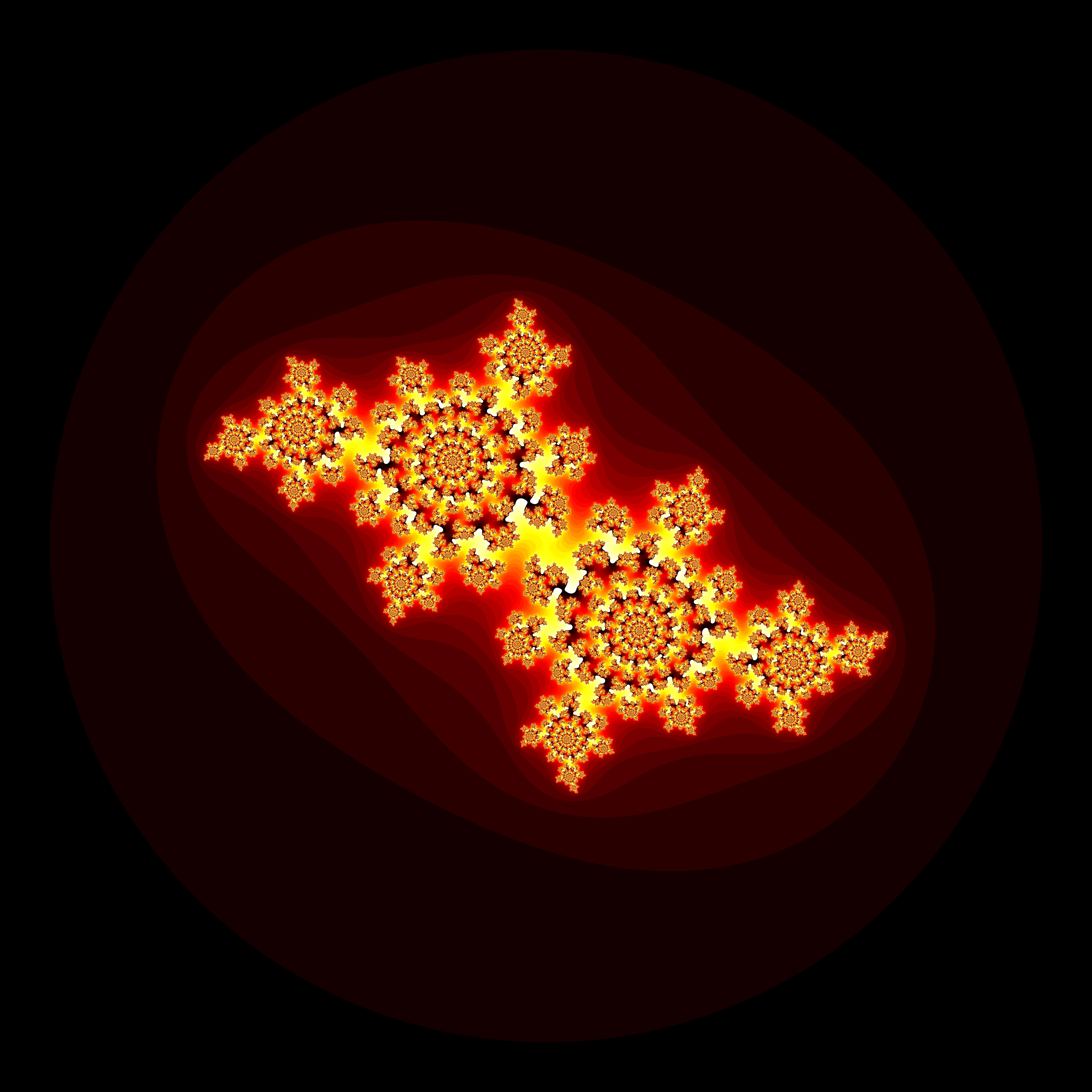 #include "ramCanvas.hpp" typedef mjr::ramCanvas3c8b::colorType ct; int main(void) { std::chrono::time_point<std::chrono::system_clock> startTime = std::chrono::system_clock::now(); const int IMGSIZ = 7680; const int NUMITR = 1024; const double MAXZ = 4.0; mjr::ramCanvas3c8b theRamCanvas(IMGSIZ, IMGSIZ, -2.2, 2.2, -2.2, 2.2); std::complex<double> c(-0.4, 0.6); for(int y=0;y<theRamCanvas.getNumPixY();y++) { for(int x=0;x<theRamCanvas.getNumPixX();x++) { std::complex<double> z = theRamCanvas.int2real(x, y); int count = 0; while((std::norm(z)<MAXZ) && (count<=NUMITR)) { z=std::pow(z, 2) + c; count++; } if(count < NUMITR) theRamCanvas.drawPoint(x, y, ct::csCColdeFireRamp::c(static_cast<ct::csIntType>(count*20))); } } theRamCanvas.writeTIFFfile("julia.tiff"); std::chrono::duration<double> runTime = std::chrono::system_clock::now() - startTime; std::cout << "Total Runtime " << runTime.count() << " sec" << std::endl; }